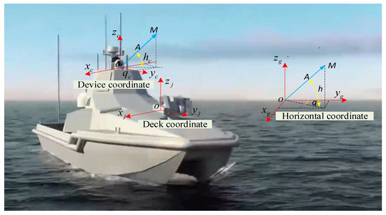 As shown in Figure 1, the coordinate system of the electro-optical device installed on the USV and connected with the carrier is . The coordinate system of the deck where the USV inertial navigation base is installed is , where , , point ship heading, starboard, and upwards, respectively [21]. The horizontal coordinate system is , with pointing due north, pointing due east, facing up, and the plane parallel to the earth. The is the reference coordinate system, and , are the axis coordinate system of the electro-optical device and inertial navigation device, respectively. These coordinate systems conform to the right-hand rule [22]. When there is no installation perpendicularity error or azimuth initialization error, the can coincide with by coordinate system translation.