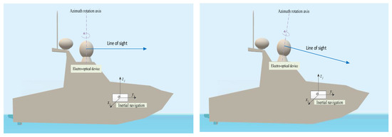 When the electro-optical device is installed on the USV, the base plane of the equipment must be level with the horizontal plane of the platform inertial navigation and aligned with the inertial navigation azimuth so that the coordinate system of the electro-optical device is parallel to the coordinate system of the deck [23]. The attitude angle of the hull sensitive to inertial navigation is consistent with the swing angle of the electro-optical device (i.e., the rotation angles of and are the same) only when the aforementioned condition is satisfied. The electro-optical equipment compensates for carrier swing by utilizing real-time calculations of the inertial navigation’s attitude data [24,25]. Achieving image stabilization necessitates maintaining consistency between the attitude angle obtained through the boat’s inertial navigation and that of the electro-optical equipment. Where there is an installation perpendicularity error, as shown in Figure 2, the above precondition is violated, and there is a deviation between the attitude angle of the electro-optical device and the inertial navigation sensitive attitude angle. This causes a deviation in the pointing of the LOS in the horizontal coordinate system after compensation.