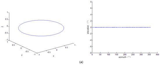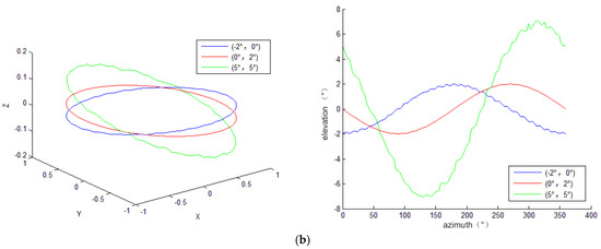 Comparison of LOS pointing curve for two cases under three-dimensional rectangular coordinates and two-dimensional angular coordinates. (a) The LOS Pointing curve without installation perpendicularity error (both