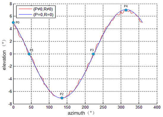 By using Equation (23), the perpendicularity error angles and can be approximated by extracting the coordinates P1 and P2 at the peak point where the LOS deviates from the sea–sky line in the circumferential scanning image and the zero-crossing point passing through the sea–sky line. At point P0 , let . Then, by using Equations (15) and (16), and are obtained, that is, the coordinate of point P0 is . Therefore, the sign of obtained using Equation (23) is consistent with that of , and the sign of is negative if there is a peak point first and then a valley point from azimuth 0° to 359°; otherwise, it takes a positive sign. There are two peak points in the elevation error curve, and two points of zero-degree intersection with the sea–sky line, and the azimuth angle difference between the two points is ; thus, the average value of the two points can be obtained to improve the coordinate accuracy of the extraction point. The aforementioned formula derivation and error analysis are mainly used to obtain the rules and effects of perpendicularity errors and on the stability, without considering the effect of small vibrations errors on the curve caused by the roll and pitch; however, the low-precision perpendicularity error can be calculated using the values of several special points P0–P4.