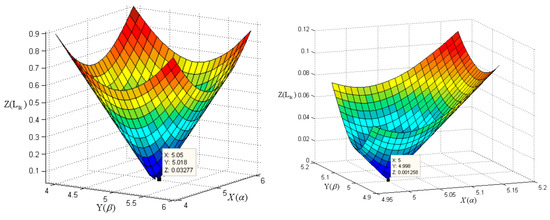 Next, the and values corresponding to the minimum value from 21 × 21 are obtained. Subsequently, and are taken as the center, and the above process is repeated to determine the and values corresponding to the minimum in the range of with a step size of 0.01°. and have very high precision, with errors of less than 0.01°. For example, substituting the measured values (44.5, 0.004) and (130.5, −7.044) of points P1 and P2 in Figure 5 into Equation (23) yields and . The minimum value in the range of ±1° with a step size of 0.1° is obtained, yielding , , and . As shown in the curve on the left of Figure 6, is a convex function of and . Next, the minimum value is obtained within the range of ±0.1° of and with a step size of 0.01°, and , , and are obtained. The deviation between the values of and and the true value (5, 5) is (0, 0.002), and the precision is less than 0.01°.