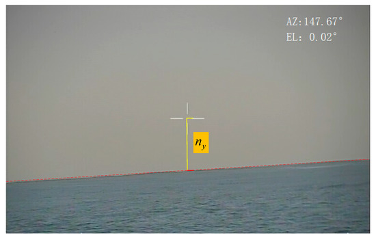 As shown in Figure 7, in Equation (28), is the number of pixels in the i-th image from the LOS to the sea–sky line in the pitching direction (positive when the sea–sky line is above the LOS, otherwise negative). is the vertical resolution of the TV, that is . is the vertical view field of the TV, that is . is the pitch error when the electro-optical device is stably controlled. For example, in Figure 7, the measured value of is −107 and the is 0.02°, according to the above parameters the can be calculated as −0.91°.