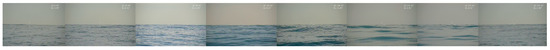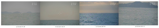 The images collected by the electro-optical device during the circumferential scanning process are shown in Figure 8. Figure 8a illustrates that at an azimuth angle of 70.28°, the center of LOS intersects with the sea–sky line and subsequently moves upwards from the sea to the sky. When the azimuth angle is 160.04° (Figure 8b), the LOS reaches the peak value of 1.076° and gradually moves downward from the sky toward the sea. At 249.94°, the LOS intersects with the sea–sky line again and then continues to move downward on the sea surface. When the azimuth angle is 339.76°, the LOS reaches the valley value of −0.9722°, and after passing the valley point, it moves from the sea to the sky in the opposite direction. The azimuth difference between the peak point and the valley point is about 180°, and that between LOS and sea–sky line intersection is about 180°. This phenomenon occurs repeatedly throughout the scanning procedure, in line with the simulation outcomes presented in Section 3.