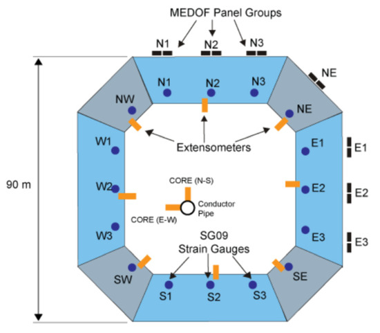 The ice load in the PLC process on the Molikpaq platform was measured in the winter season of 1985–1986. The Molikpaq platform is a wide annular steel caisson with a width of 90 m at the water line, as shown in Figure 1. The platform was used as a drilling platform in the Beaufort Sea. To study the ice action on the platform, it was equipped with MEDOF panels, strain gauges, extensometers, tiltmeters, and accelerometers, as shown in Figure 2 [18].
