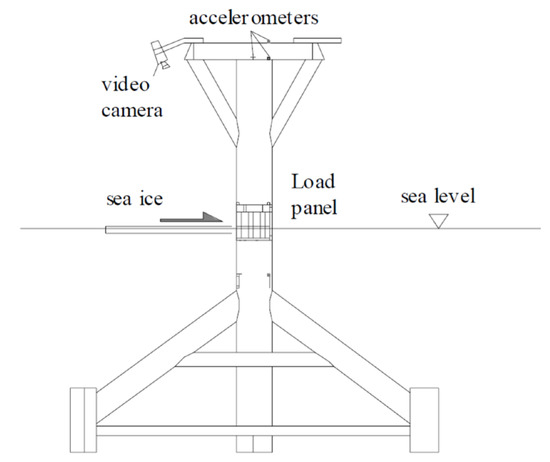 PLC ice action has also been observed on most jacket offshore oil and gas infrastructures in Bohai Bay, China. It has occurred on jacket platforms with three or four legs or monoleg mooring piles. It has caused strong lock-in vibrations with a magnitude of up to 2 g/s2 and a costly duration of more than 20 min. Ice breaking cones were added on most of the platforms after the frequency lock-in vibration damaged the gas pipe on the topside. The ice load during the PLC process was measured by load panels that covered about 170 degrees of the jacket leg surface with a diameter of 1.5 to 2 m. The dimensions of each load panel were 62 cm in height and 27 cm in width. Along with the load data, the structure response was measured by accelerometers. The ice failure process against the structure was recorded by video cameras and in situ observations. Figure 3 and Figure 4 show the structures and measurement system on the mooring pole of JZ9-3 oil field.