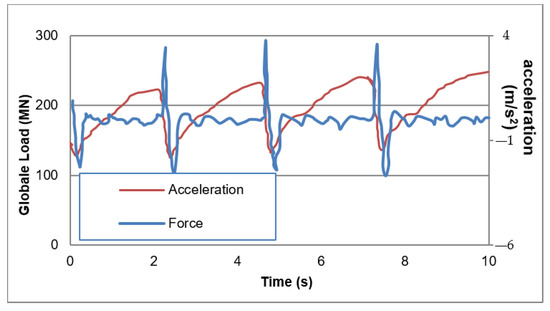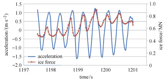 The ice–structure interaction process experienced by the Molikpaq platform in 1986 was studied by Jefferies, M. and Spencer, P. [9] and Jefferies [19]. Based on the analysis of the ice load and acceleration data shown in Figure 9 and Figure 10, they suggested that although the ice load was dynamic, the system was not in an oscillation mode. This implies that dynamic unloading in a highly damped situation would be a more accurate description of ‘dynamic ice loading’.
