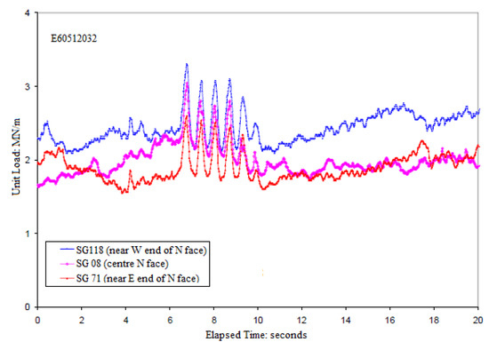 Figure 12 displays the ice load data recorded by the load panels on the Molikpaq platform. The forces have the same simultaneous characteristic even though the load panels are 30 m apart from each other. Based on this observation, Jefferies, M.G. and Wright, W.H. [9] identified the following features of the PLC ice–structure interaction on the Molikpaq: