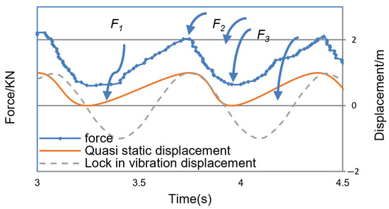 In the figure, the interaction in one cycle can be characterized by three points F1 to F3. The stage between F1 and F2 is the loading phase and F2 to F3 is the unloading phase. The ice failure, ice load, and structure’s status in the two stages are listed in Table 2 and illustrated in Figure 14. It is assumed that the ice moves toward x+ direction at velocity Vice, the magnitude of the vibration is A, and the velocity of the structure at the waterline is Vs.
