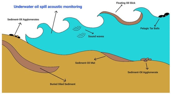 Understanding the movement of oil droplets in water is an important factor in the study of monitoring technology. Through the research, it is found that the oil spill behavior and fate of subsea oil spill in the rising process are obviously different from that of surface oil spill due to the influence of tide, temperature, and pressure. The behavior of underwater oil spill mainly includes oil and gas particle size distribution, ascent velocity, oil and gas separation, and reel suction, which will eventually exist in the hydrate or dissolve in the water column, or exist in the suspended plume. There have been a large number of experimental and simulated studies on underwater oil spills, such as the real distribution of oil droplets released from the seabed, the uncertainty of the size distribution of oil droplets affecting the short-term fate of deep-sea oil, and the horizontal wave and spiral upward movement of rising oil droplets [6,14,15]. Most oil droplets float under the combined effect of initial momentum and buoyancy, and those that rise to the sea surface form an oil film that is influenced by both ocean currents and wind, allowing it to travel further and diffuse over a larger area. Oil droplets of different sizes undergo horizontal diffusion in water, with larger ones floating to the sea surface and expanding into an oil film due to the influence of gravity, while smaller ones remain suspended in the water [16]. In the near-shore environment, oil spills can interact with suspended sediment, forming oil sediment residues [17,18,19]. Figure 2 shows a conceptual model of the various oil residues found in the nearshore environment, where oil interacts primarily with coarse sediments to form sediment–oil agglomerates; and large oil slicks can also interact with sediments to produce sediment–oil mats, which float after long-term weathering to a black or brown ball of oil of varying shapes that floats in nearshore waters. Oil spill monitoring requires advance knowledge of the dispersal behavior of spilled oil and the formation of conjunctures with other materials. A conceptual model of nearshore oil residues can provide a reference aid for the implementation and deployment of oil spill monitoring. Previous studies have summarized the characteristics of ocean oil spills from the conditions, effects, and processes of oil and gas diffusion, which can help subsequent studies to accurately grasp the evolutionary pattern of oil spills and provide reference guidance for acoustic monitoring.