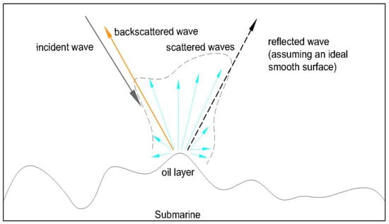 In nature, sound waves are scattered and reflected when they encounter obstacles [44]. Figure 3 shows the process of sound waves scattering by a target object, which occurs when the sound wave is projected onto a rough interface or particles in a medium, and propagates in different directions [43,45]. The condition for scattering is that the wavelength of the sound wave is much smaller than the size of the obstacle, and small obstacles will become new sources of ultrasound and emit waves in all directions when scattered [46]. In the event of an oil spill, seawater and oil and gas form three different media, between the oil droplets and seawater, between the bubbles and seawater, and between the oil droplets and the bubbles [47,48,49]. When a sound wave propagates to the interface between oil droplets, seawater, and bubbles, scattering occurs. In the process of scattering, the scattered signal carries information about the oil and gas obstacles due to different mechanisms of scattering echo generation. In underwater oil spill monitoring, the scattered echo signal produced by the detection sound wave encountering an oil and gas target is used to obtain dynamic information about the spill. Acoustic backscatter signals can also be used to analyze the state information of oil and gas.