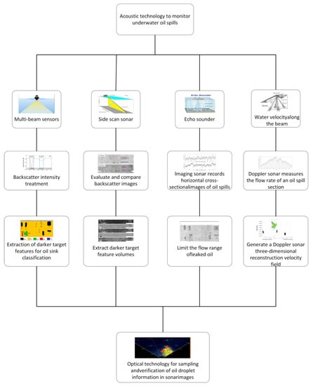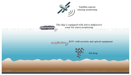 Water acoustic monitoring technology is achieving a monitoring mode that combines active detection with passive detection [98]. When pressurized oil and gas leak from the subsea oil pipeline, it will suddenly expand and release, generating sound wave. A passive detection mode can be used to monitor and locate the oil and gas injection position using acoustic instruments such as hydrophones. For the diffusion of oil and gas in water, a sonar array can be used to achieve high-resolution scanning and detection of the oil spill source. The sonar emits sound wave towards targets such as oil droplets, receives echo signals, and, thus, can obtain real-time information on their movement and the formation of oil slicks.