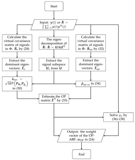 The core idea of the adaptive beamforming based on oblique projection (OP-ABF) is to estimate the oblique projection matrix by the received data. Once the OPMCV is obtained, the MVDR beamformer is derived by an arithmetical manipulation from (9) and (17):