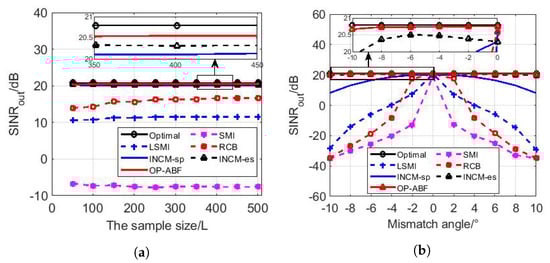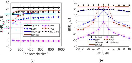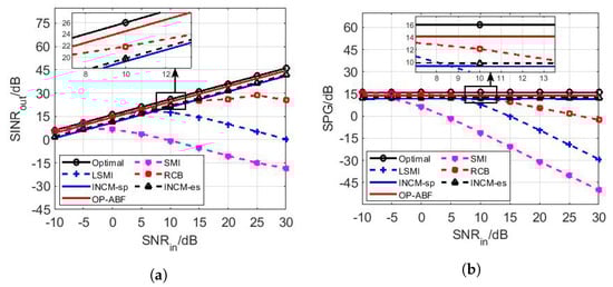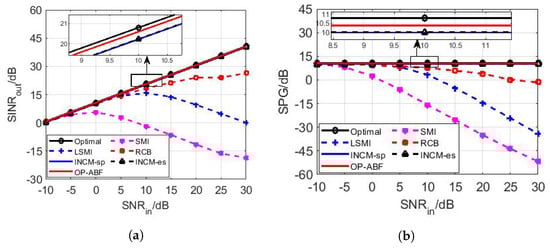 The parameter settings are the same as Section 5.1.1 Regardless of the SINRout or the SPG in Figure 6a or Figure 6b, the performance curves of the SMI, the LSMI, and the RCB are consistent with their own, as shown in Figure 3. The SINRout and the SPG of the two INCMs and the OP-ABF keep the same trend as the optimal; the difference is that the performance of these INCMs is always 3 dB–4 dB lower than that of the optimal, and that of the OP-ABF is the closest to that of the optimal drop of no more than 2 dB because the OP operator can eliminate the SV mismatch no matter the type of mismatch, while the other methods do not perform well for the mismatch caused by scattering effects. As a result, the SPG of the OP-ABF is the highest compared with other algorithms.