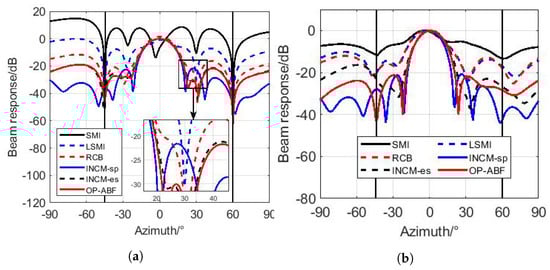 In this case, the SNRin and the sample size are the same as those in Section 5.2.3. In Figure 8a, both beampatterns of the SMI and the LSMI show the signal self-nulling phenomenon [42] in the vicinity of the direction of the desired signal, which results in their SINRout degradation. Although the beampattern of the INCM-sp has a narrower mainlobe bandwidth than that of the RCB, the interference at −45° is not perfectly suppressed by the INCM-sp. Fortunately, the OP-ABF accurately suppresses all interferences, while it maintains its overall performance, and its sidelobe level is slightly lower than that of the INCM-es.