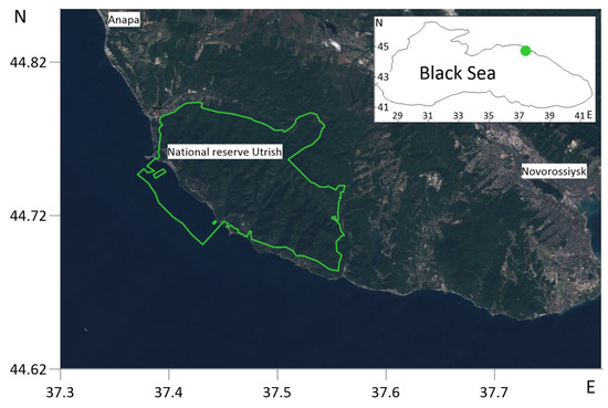 The State Nature Reserve (NR) of Utrish was founded in 2010 in the Krasnodar region of the Russian Federation and covers a significant part of the Abrau peninsula (NR Utrish [1]). NR Utrish includes lands of the forest fund—9911 hectares (87%)—and a section of the Black Sea, with a total area of 1428 hectares (13%), see Figure 1. This NR is one of a few Russian reserves that contains the marine territory of the Black Sea and the only one on the Caucasian coast [2].