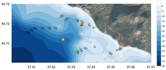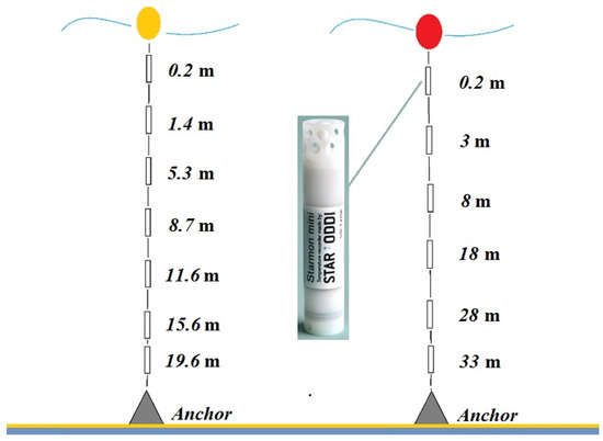 Continuous measurements of water temperature are quite rare in the area of the NR Utrish, especially on a vertical line. The chain of thermistors was moored three times in the marine part of the NR Utrish. It consisted of 6–10 thermistors Starmon StarOddi, Iceland (see Figure 2 and Figure 3), accuracy of the thermistors was ±0.025 °C and time step was 1 min. A series of water temperature measurements was held from 31 January 2020 to 21 April 2020 (mooring depth 16 m), from 16 July 2020 to 14 March 2021 (mooring depth 20 m) and from 15 March 2021 to 19 May 2022 (mooring depth 34 m). Vertical thermal structure data are available until 25 October 2021, because severe fall storms and biofouling sank the thermochain. All data after 25 October 2021 referred to the bottom horizon. The same type of thermistor was also successfully used in Baltic Sea studies from 2019 to 2021 [58,59].