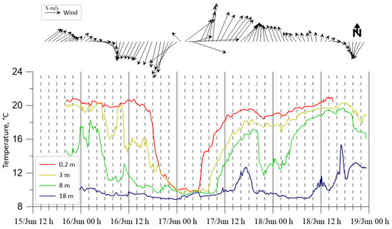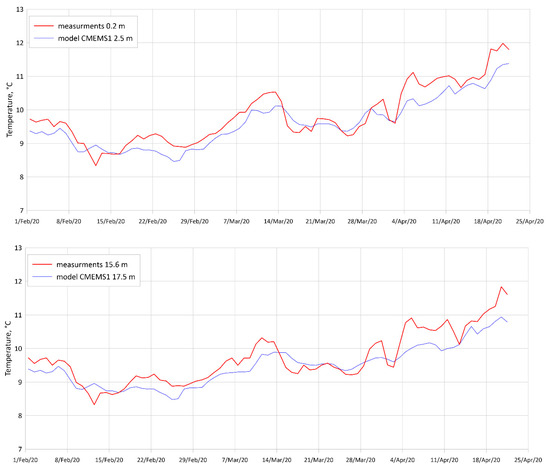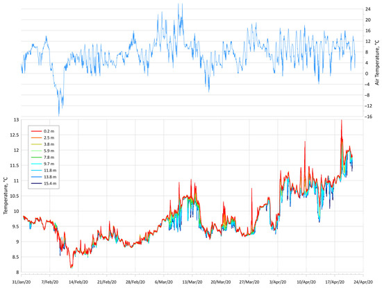 In the first measurement period, coastal waters were totally mixed during February 2020 (Figure 4). The temperature difference between horizons was less than 0.5 °C. Stratification began from 7 March 2020, when an upper layer started warming (temperature differs from the bottom to 0.5–1 °C). The water temperature increased from 8.1 °C on 12 February to 13 °C on 20 April. On 12 February 2020, there was a minimum temperature of 8.13 °C at the bottom (15.4 m). The air temperature greatly decreased to −16 °C on 9 February.