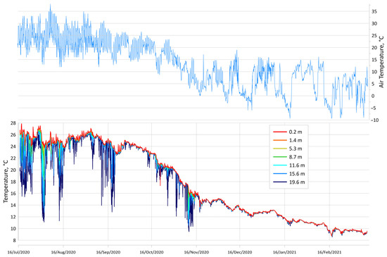 Water temperature at different depths according to the thermistor chain data from 16 July 2020 to 20 February 2021—bottom panel. Air temperature according to the Anapa weather station data—upper panel.