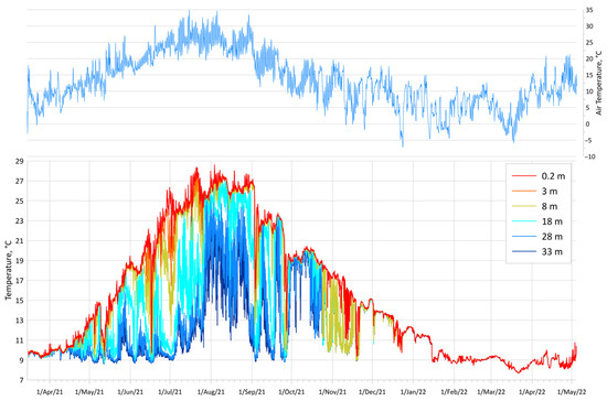 Figure 4, Figure 5 and Figure 6 show the water temperature at different depths and air temperature during the first, second and third measurement periods of the thermochain. The maximum temperature (28.6 °C) during all measurements was registered by a surface sensor (0.2 m) on 3 August 2021. The minimum temperature was registered at the bottom (33 m) on 21 March 2022 and was equal to 7.7 °C.