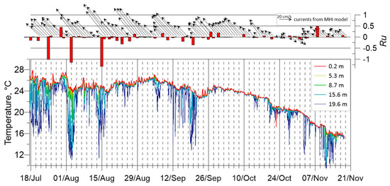 Upwelling in the first few days of August 2020 was incomplete (Figure 8), but the temperature in the bottom layer dropped to 11.8 °C. The amplitude was significantly less at the 8 m horizon, with the temperature changing from 24 °C to 18 °C in 5 h. The criterion of the upwelling was less than −1, indicating the Ekman nature of the event. Another similar case was registered on 13–14 August 2020. With strong upwelling winds, the temperature dropped again on the bottom layer to 11 °C. SST oscillations were comparable with the diurnal cycle and equal to ~1.5 °C.