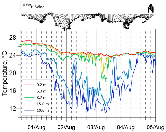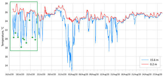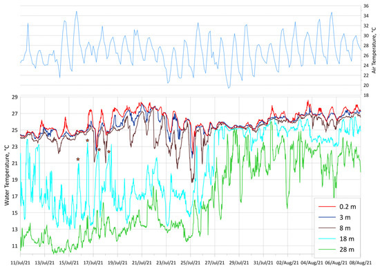 We did not consider the amplitude of the daily temperature variations in detail. However, general estimates of the average amplitude/magnitude are listed below. The average amplitude of the diurnal cycle is about 0.4–0.7 °C. The high amplitude in 2020 was 1.1–1.3 °C in July–August. Anomalous daily temperature fluctuations were observed in the upper layer in July–August 2021 (Figure 13). The amplitude was 2.4 °C on 14–15 July and 1.8 °C on 5–6 August. Air temperature daily fluctuations were in a range of 24–32 °C and were not anomalous in this season. Abnormal fluctuations with an amplitude of up to 4 °C were observed on 17–18 July, but it should be noted that night cooling occurred earlier at lower horizons, which could indicate the advective nature of these oscillations. The superposition of the diurnal cycle and the internal wave with an inertial period (~17 h) could be assumed, but this fact requires additional measurements and data. Our results are in good agreement with earlier research. The maximum diurnal cycle amplitude of 5.1 °C was observed at an open part of the Black Sea by the thermoprofiler buoy [76].