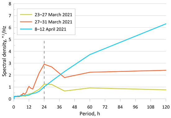Usually, this criterion corresponds to the situation when 3–4 days out of 5 days had a daily cycle with a temperature amplitude of more than 0.3 °C. An example of such spectra for various days is shown in Figure 10. A peak for a period of 24 h is clearly visible for March 27. A peak is visible, but the amplitude of the spectral density oscillation was less than 1 °C 2/Hz for March 23. On 8 April, a peak for a period of 24 h was absent.