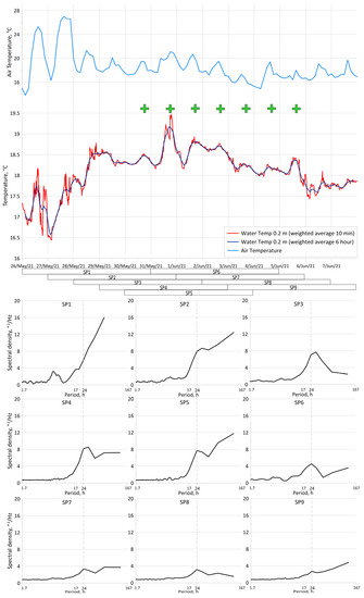 Diurnal cycle of the water and air temperature. Rectangles (SP1 … SP9) below x-axis show 5-day moving periods for spectra calculation. Green crosses show days with the visually confirmed diurnal cycle. Bottom panel: examples of nine spectra from 26 May to 7 June 2021.