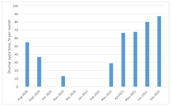 For the period from august 2020 to July 2021, we calculated the repeatability of days with an observed diurnal cycle for the different months (Figure 12). We obtained the maximum of the diurnal cycle in July 2021 (88%) and its absence from October to February.