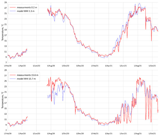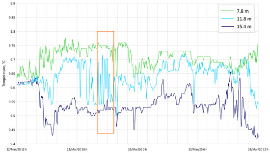 In the second period, the minimal temperature was observed on 18 February 2021 and reached 8.54 °C at the bottom (19.6 m) when the air temperature was around −10 °C.