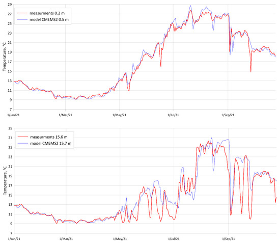 The third measurement period is a good illustration of the annual water temperature variability (Figure 6). It begins with a completely mixed layer in March 2021, with a temperature of 9.6–9.8 °C. The heating of the upper layer begins in April.