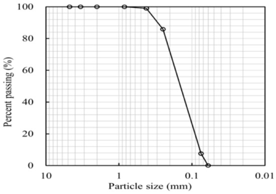 Silica sand No. 7 was used for the ground composition of the shaking table test. Figure 1 presents the grain size distribution of silica sand No. 7, which is included in the liquefaction hazard range (grain size range: 0.01–1.0 mm) suggested by the Applied Technology Council [34]. Table 1 lists the physical properties of the silica sand. The specific gravity (Gs) of the silica sand No. 7 used in this test was 2.65, the maximum dry unit weight was 18.17 kN/m3, and the minimum unit dry weight was 13.47 kN/m3. The dimensions of the model embankment were determined virtually based on the coastal embankment located in the S-Project in South Korea. Three types of similitude law were suggested by Iai [35]. Given that liquefaction closely resembles the strain-softening behavior, the third form of the similitude law was applied, and the ratio of the similitude was 40. Table 2 lists the properties of the embankment models.