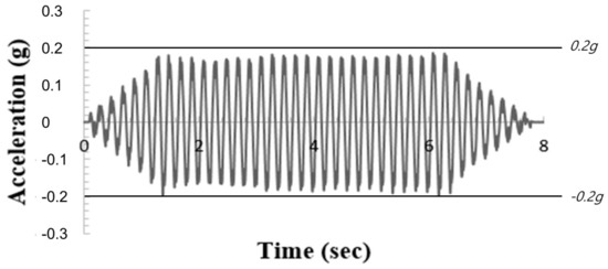 Figure 2 presents the input base motion profile, which was measured on a shaking table. In the shaking table test, a sinusoidal wave of 5 Hz was determined as the input motion, which corresponded to a sinusoidal wave of 0.8 Hz at the prototype scale while applying Iai’s type 3 similitude relationship. Each sine wave excitation had a duration of 8 s; namely, 1.5 s for the increasing section, 5.0 s for the constant section, and 1.5 s for the decreasing section with an input acceleration of 0.2 g, which is the return period of a 2400-year earthquake in the Korean seismic design code. A total of five vibrations were excited to analyze the reliquefaction behavior due to successive earthquakes. The excitation interval was set to 1800 s so that the excess pore water pressure could be sufficiently dissipated. As a result of observing the dissipation of the excess pore water pressure through the measured pore water pressure with the pore water pressure transducer, it was confirmed that the excess pore water pressure converged to zero at around 600 s.