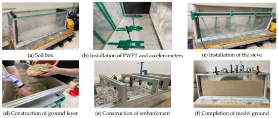 To analyze the behavior of the coastal embankment with respect to the thickness of the non-liquefiable layer, the soil compositions were divided into two cases as follows. In Case 1, the soil layer comprised only a 50 cm liquefiable layer, and in Case 2, there were two layers; i.e., a 32.5 cm lower liquefiable layer and a 17.5 cm upper non-liquefiable layer. For each experiment, a reliquefaction test was conducted with five sine wave excitations using a shaking table. Gravel with a size ranging from 1 to 2 cm and a unit weight of 2.0 kN/m3 was used for the embankment, which had a height of 10 cm and a fixed slope ratio of 1:1.8. The model simulated an actual embankment at a scale of 1:40. Given that an embankment is a fill structure on a road surface, an overload of 53 kg was applied while considering the actual weight of the section. To form the ground of the liquefiable layer, a sieve was installed on the soil box. Next, the soil particles were separated as evenly as possible; they were slowly dropped into the water to create a composition similar to the formation principle of the sedimentary layer, and the silica sand was saturated in water for 72 h. The model ground was formed at a relative density of 50%. The relative density was measured during a preliminary test. A sample could be placed every 10 cm from the bottom of the soil box when preparing the model ground. The ground composition was stopped; the sample was removed; and the weight, volume, and water content were measured to calculate the unit weight and relative density when the ground composition was completed. Afterwards, the model ground was formed in the same way, and the target relative density was constructed by making the weight of soil used in ground composition the same as that in the preliminary test. The non-liquefiable layer formed a total liquefiable ground, and then a hose was installed and dewatered after excavating so that the location did not interfere with the installation of the embankment and instrumentation to create the non-liquefiable layer. Figure 3 illustrates the procedure employed for the experimental setup. The test was conducted using a soil chamber with a length, width, and height of 200 cm, 50 cm, and 70 cm, respectively. To reduce the boundary effect of waves due to the stiffness of the soil chamber during shaking, a 5 cm thick sponge was installed on both walls of the soil chamber. Figure 4 and Figure 5 present the cross sections in the experiment, including the measuring instrument. To analyze the ground behavior during reliquefaction and the occurrence of liquefaction with respect to depth, piezometers were installed at the end of the embankment, at the center of the embankment, and in the free field at depths of approximately 10 cm, 20 cm, 30 cm, 40 cm, and 45 cm from the ground surface. The piezometers were fixed using aluminum rods to maintain a constant height in the liquefiable soil. Accelerometers were installed at depths of 0, 10, 20, 30, 40, and 50 cm from the ground surface and fixed to a square acrylic plate to ensure soil-like behavior when liquefaction occurred. Linear variable differential transformers (LVDTs) were installed at the center of the embankment and free field to measure the amount of settlement in the embankment and free field. The test programs are summarized in Table 3.