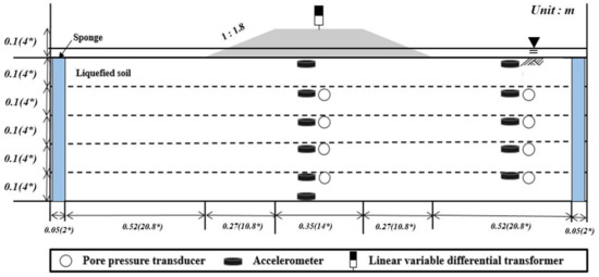 Schematic drawing of test section of liquefiable ground for model scale of Case 1 (* prototype scale).