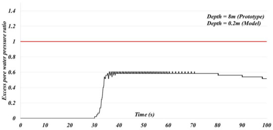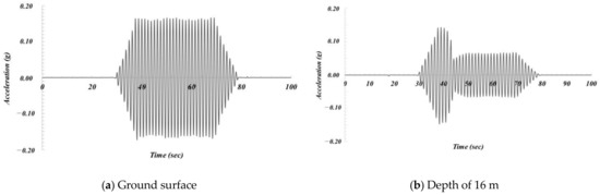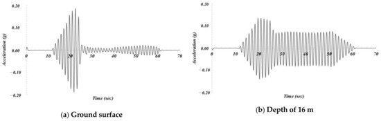 All test results were described at the prototype scale by applying a similitude ratio. To obtain data on the shaking load for each ground layer and check the state of liquefaction, 11 accelerometers and 8 pore water pressure transducers were installed for the experiment as shown in Figure 4. Figure 6 presents the acceleration–time history measured during the first excitation using accelerometers installed on the ground surface and at a depth of 16 m in the free field. The acceleration–time history also indicates the occurrence of liquefaction. Figure 6a reveals that the acceleration decreased rapidly due to the occurrence of liquefaction at the ground surface below the embankment. Given that the ground behaved similarly to a liquid when liquefaction occurred, the ground reaction did not occur and the amplitude decreased [36]. In contrast, liquefaction did not occur at a depth of 16 m; therefore, the acceleration value did not decrease significantly. It was also confirmed by the excess pore water pressure ratio and acceleration that during the first excitation, liquefaction occurred from the ground surface to a depth of 8 m and not more than a depth of 12 m from the ground surface (Figure 7).