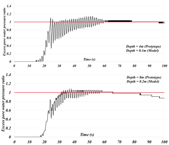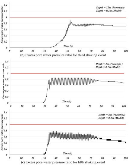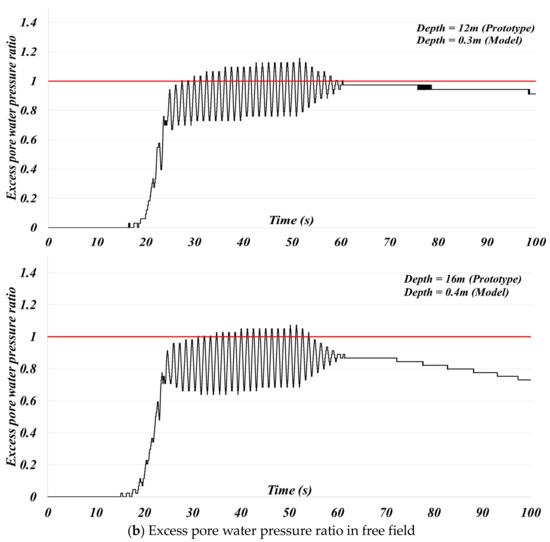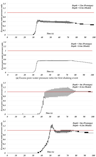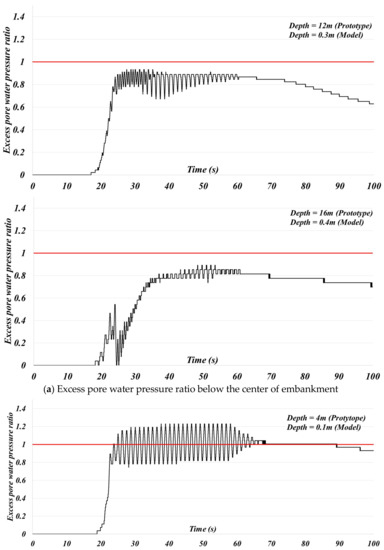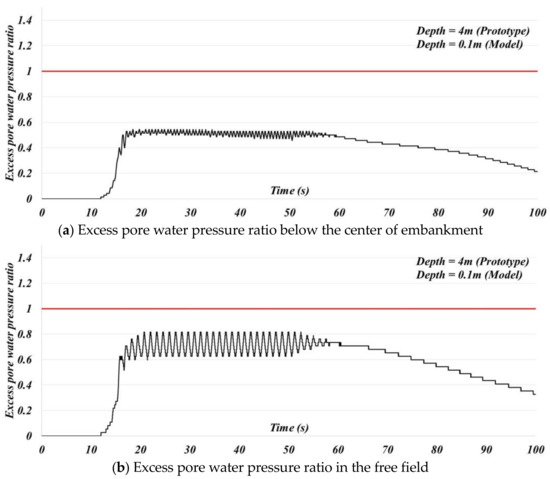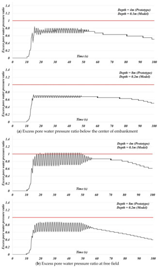 The excess pore water pressure ratio was calculated by dividing the excess pore water pressure generated over time by the effective stress. The effective stress below the embankment was calculated by applying an additional surcharge of the embankment body. Based on previous research, the occurrence of liquefaction is determined when the excess pore water pressure exceeds 1.0 [37,38,39]. The liquefied ground was determined when the excess pore water pressure increased to a value larger than 1.0. Figure 7, Figure 8 and Figure 9 present a representative graph of the excess pore water pressure ratio with a depth below the center of the embankment and the free field due to successive excitations; in addition, the maximum values of the excess pore water pressures in all cases are described in Table 4 and Table 5. The porewater pressure transducer installed at a 8 m depth in the free field did not work because of technical issues; therefore, measurements could not be performed. Below the center of the embankment (as shown in Figure 7), the excess pore water pressure ratios at depths of 4 m and 8 m exceeded unity, indicating that liquefaction occurred. The excess pore water pressure ratios at depths of 12 m and 16 m were less than 1 as listed in Figure 7a and Table 5. These findings indicated that liquefaction did not occur. However, according to the piezometers located in the free field (Figure 7b), liquefaction occurred at all depths during the first excitation. This indicated that due to the overload pressure caused by embankment subsidence, the ground-confining pressure increased more than that in the free field, leading to different trends from those obtained at a depth of more than 12 m.