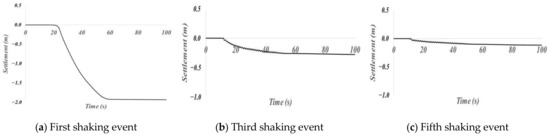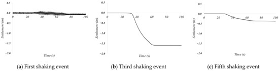 As shown in Figure 10, settlement (as measured using the LVDTs) rapidly occurred during the first excitation and substantially decreased from the first to fifth excitations. The settlement increased while the excitation continued, and after excitation ended, little additional settlement occurred even though the excess pore water pressure still remained. This result was consistent with that of a previous study [40]. Table 6 presents the data for the settlement amount and relative density according to the number of excitations. The relative density was calculated using the value obtained by dividing the total volume and mass of the ground while considering the settlement. Although the relative density should be presented with respect to each ground depth and excitation step, due to experimental limitations, this paper presents the relative density for the entire ground. These findings suggested that the relative density increased to 67.7% during the fifth excitation; that as the number of excitations increased, the settlement amount decreased; and that liquefaction did not occur in the lower ground in the free field. In addition, when the relative density reached 60%, the excess pore water pressure ratio did not exceed unity except at a depth of 4 m; therefore, further liquefaction did not occur below the embankment under an excitation level of 0.2 g.