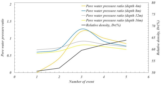 Figure 11 presents the correlation between the excess pore water pressure ratio and the relative density at different depths below the center of the embankment for comparison. The relative density gradually increased as the number of excitations increased, and liquefaction occurred in the first excitation at depths of 4 m and 8 m as the excess pore water pressure ratio exceeded 1. However, liquefaction did not occur at depths of 12 m and 16 m when the excess pore water pressure ratio was less than 1. In addition to the non-occurrence of liquefaction, the increasing trend of relative density declined. When the relative density exceeded approximately 65–66%, the excess pore water pressure ratio decreased to values less than 1 at all depths. These findings suggested that as the number of excitations increased and the relative density reached a certain value, the ground density increased; thus, the excess pore water pressure ratio did not exceed 1, and liquefaction did not occur.