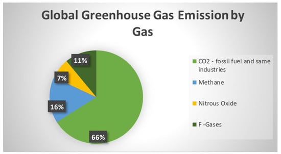 According to WMO Greenhouse Gas (GHG) Bulletin of 2020 which published on October 2021, the primary Greenhouse Gases (GHG) that human activity releases on a global scale includes [1]: (1) Carbon dioxide (CO2), produced mainly by the burning of fossil fuels; (2) Methane (CH4), produced because of various human activities, including farming, waste management, and energy consumption; (3) Nitrous oxide (N2O), produced by burning fossil fuels and using fertilizers in agriculture, and (4) Fluorinated gases (F-gases), produced by industrial operations, refrigeration, and other factors, including hydrofluorocarbons (HFCs), perfluorocarbons (PFCs), and sulfur hexafluoride (SF6). Figure 1 shows the four main gases that cause GHG, with CO2 accounting for 66% of global GHG overall and divided into two sections.
