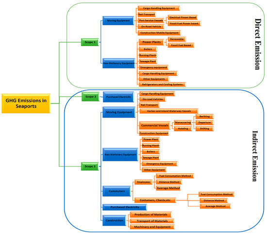 Scope 1 covers the port authorities’ direct emissions, such as those from machinery or industry within the port’s boundaries. After this, it considers all seaport activities, infrastructure ownership, and machinery. Scope 1, which is created by the authors based on their research findings, discusses, and which categorizes with further sections, as shown in Figure 6, is as follows:
