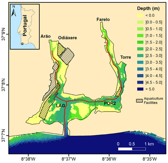 Bathymetry of the study area with the main freshwater sources (Arão, Odiáxere, Farelo, and Torre) and aquaculture facilities. The two bivalve production zones are also identified (LAG and POR2).