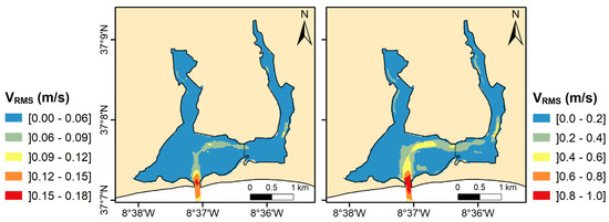 VRMS (m/s) during a tidal cycle for neap tide (left) and spring tide (right) at the Ria de Alvor.