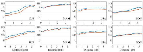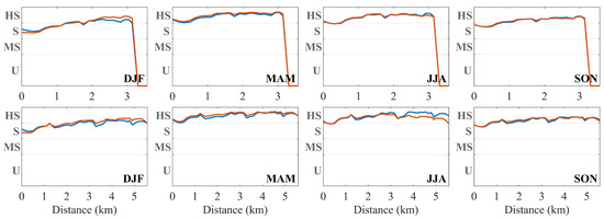 Ria de Alvor suitability index for mussels throughout the axis of the west (top panel) and east (bottom panel) branches (red lines in Figure 1). The x-axis is the distance from the mouth of the lagoon and the y-axis represents the SI classes (U—Unsuitable, MS—Moderately Suitable, S—Suitable, and HS—Highly Suitable). Blue and orange lines stand for the present and future scenarios, respectively.