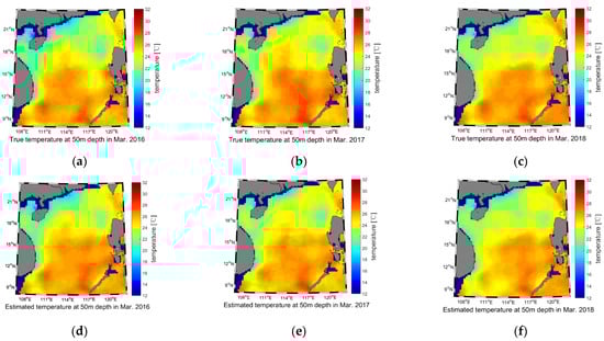 Temperature reconstruction results of the 50 m water depth for March 2016–2018. (a) True temperature of 2016; (b) True temperature of 2017; (c) True temperature of 2018; (d) Estimated temperature of 2016; (e) Estimated temperature of 2017; (f) Estimated temperature of 2018.