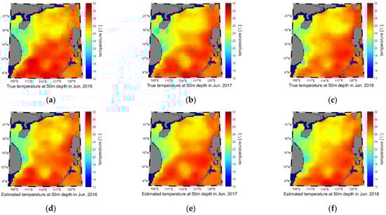 Temperature reconstruction results of the 50 m water depth for June 2016–2018. (a) True temperature of 2016; (b) True temperature of 2017; (c) True temperature of 2018; (d) Estimated temperature of 2016; (e) Estimated temperature of 2017; (f) Estimated temperature of 2018.
