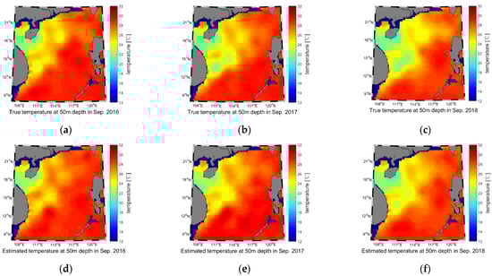 Temperature reconstruction results of the 50 m water depth for September 2016–2018. (a) True temperature of 2016; (b) True temperature of 2017; (c) True temperature of 2018; (d) Estimated temperature of 2016; (e) Estimated temperature of 2017; (f) Estimated temperature of 2018.