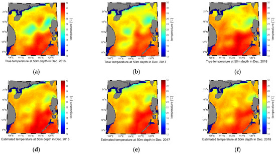 Temperature reconstruction results of the 50 m water depth for December 2016–2018. (a) True temperature of 2016; (b) True temperature of 2017; (c) True temperature of 2018; (d) Estimated temperature of 2016; (e) Estimated temperature of 2017; (f) Estimated temperature of 2018.