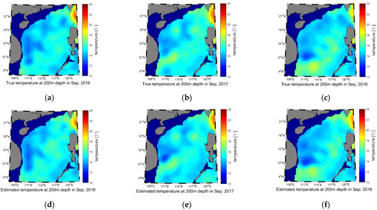 Temperature reconstruction results of the 200 m water depth for September 2016–2018. (a) True temperature of 2016; (b) True temperature of 2017; (c) True temperature of 2018; (d) Estimated temperature of 2016; (e) Estimated temperature of 2017; (f) Estimated temperature of 2018.