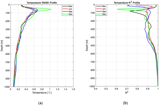 RMSE and R2 results of temperature for 2016–2018: (a) 3-year average RMSE for 4 months; (b) 3-year average R2 for 4 months. The RMSE and R2 count all grid points for each depth layer.