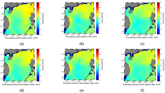 Salinity reconstruction results of the 50 m water depth for March 2016–2018. (a) True salinity of 2016; (b) True salinity of 2017; (c) True salinity of 2018; (d) Estimated salinity of 2016; (e) Estimated salinity of 2017; (f) Estimated salinity of 2018.